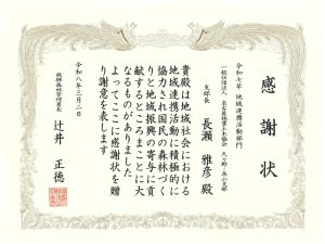 2026年3月18日中部森林管理局管内では毎年、災害時における防災ボランティア活動、国土緑化推進等を通じた森林づくり活動並びに地域の奉仕活動等における地域連携・社会貢献活動等に進んで携わる企業、団体に対し局長感謝状が贈呈されており、令和7年度の取り組んだ活動について、令和8年3月2日付けで佐伯知広 局長感謝状の贈呈を受けました。