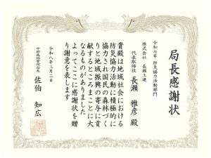 株式会社長瀬土建は「防災協力活動部門」において局長感謝状を、久々野高山支部は「地域連携活動部門」において支部長として森林管理署長感謝状を頂きました。